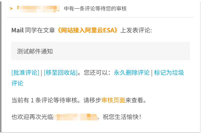 <h2 style="border-bottom:1px solid #DDD;font-size:14px;font-weight:normal;padding:13px 0 10px 8px;"><span style="color: #f59200;font-weight: bold;">> 「 </span><a style="text-decoration:none;color: #f59200;" href="' . home_url() . '">' . $blogname . '」</a> 中有一条评论等待您的审核 </h2>